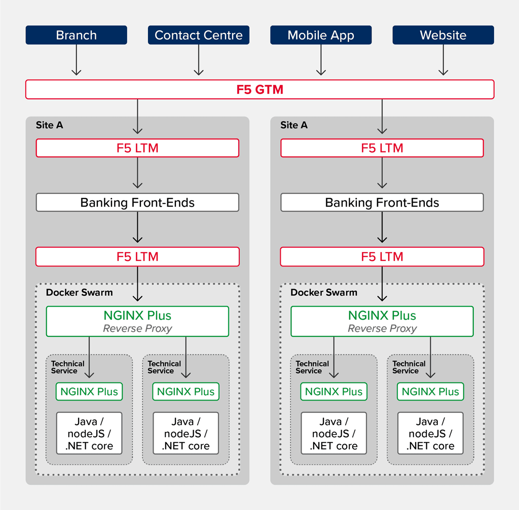 Before African Bank selected NGINX Plus, its monolithic architecture employed a variety of tools including typical application delivery controllers, like F5 BIG-IP for global traffic management, and F5 WAF for security. Rather than replacing those tools, though, the bank saw NGINX Plus augmenting existing infrastructure through powerful features like reverse proxy and load balancing. What NGINX Plus provided, ultimately, was a powerful multi functional component which addressed all of their use cases and could be easily deployed in a flexible manner.