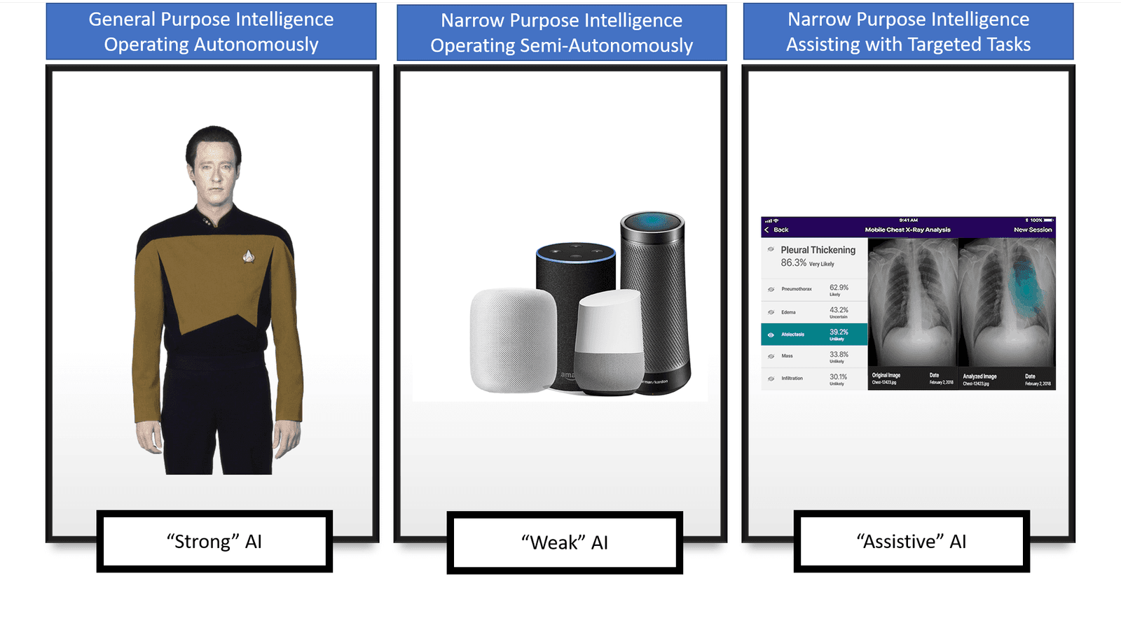 Past the “strong” AI is a simpler, more focused version that can be described as a “weak” model of artificial intelligence: it operates autonomously like our movie android would but is narrow of purpose. It’s capable of simple adaptation and learning within the confined realm which it operates. These systems are experts in things that are designed into them but don’t have any capacity to learn new tricks on their own. We interact with them every day by name: Siri, Alexa, Google. We ask them to roll up the windows on our cars, or to stay somewhat distant from the car in front of us. And although we can ask them questions about the weather that they can probably answer, they’re unlikely to give us sage advice about our relationships like Lieutenant Commander Data might.