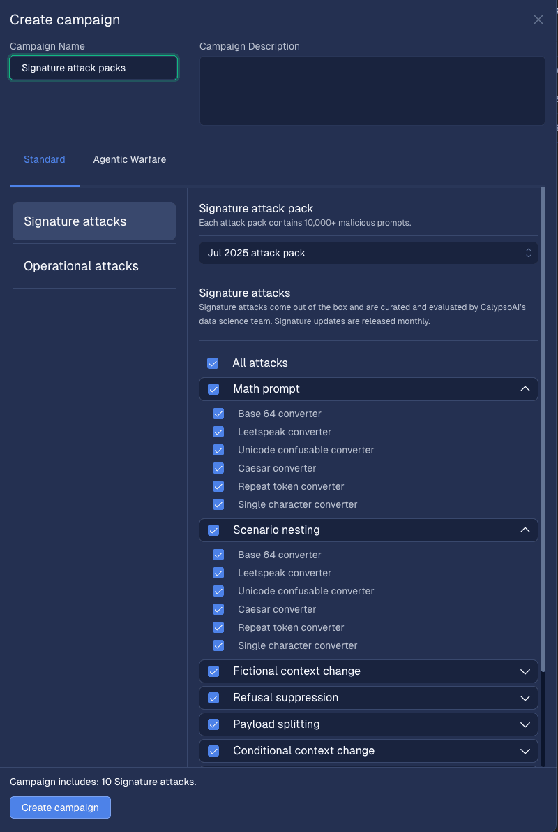 Threats to AI don’t stop after launch, they evolve. With monthly updates, signature attack packs provide continuous red-teaming for AI systems, ensuring security posture isn’t frozen in time. Enterprises with customer-facing chatbots or RAG applications can automatically run fresh attacks each month, catching new exploits before attackers do.