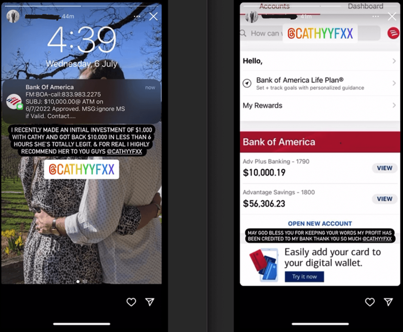 The bad actors posted on their Instagram stories a not-so-subtle message about getting involved in a bitcoin mining scheme. It was a screenshot of an iPhone lock screen which included a picture from their profile (in the case of Trevor, a picture of he and his wife from his profile) and displayed a bogus text message from BofA, followed by a screenshot from his supposed bank account: