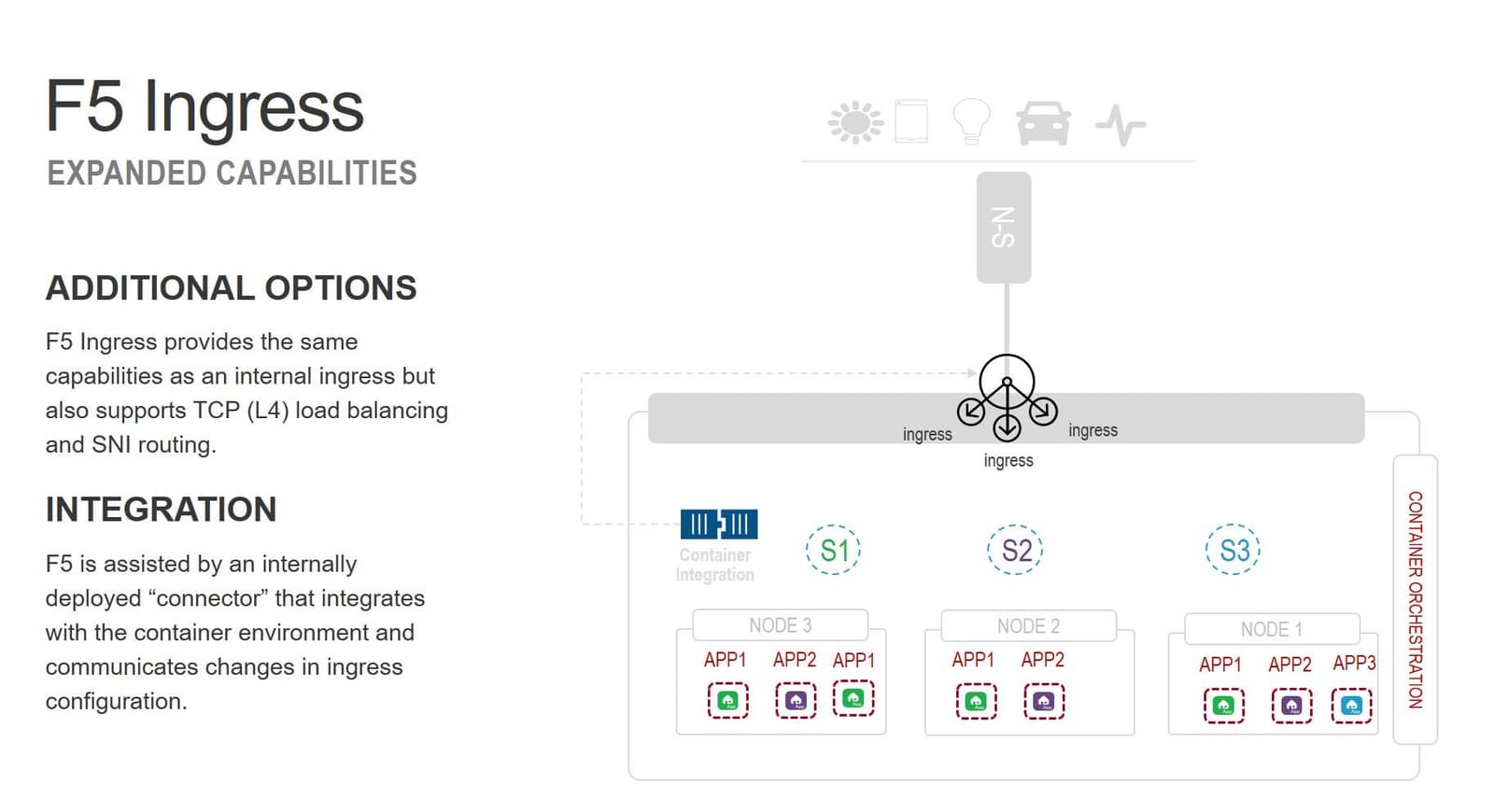 F5 is typically deployed external to the container environment. It's often used as a load balancing solution to expose clusters externally, i.e. provide public access to services comprised of a container cluster. A CNCF survey found that 67% of respondents choose a load balancer option to expose cluster services externally, with another 33% leveraging ingress (L7) capabilities.