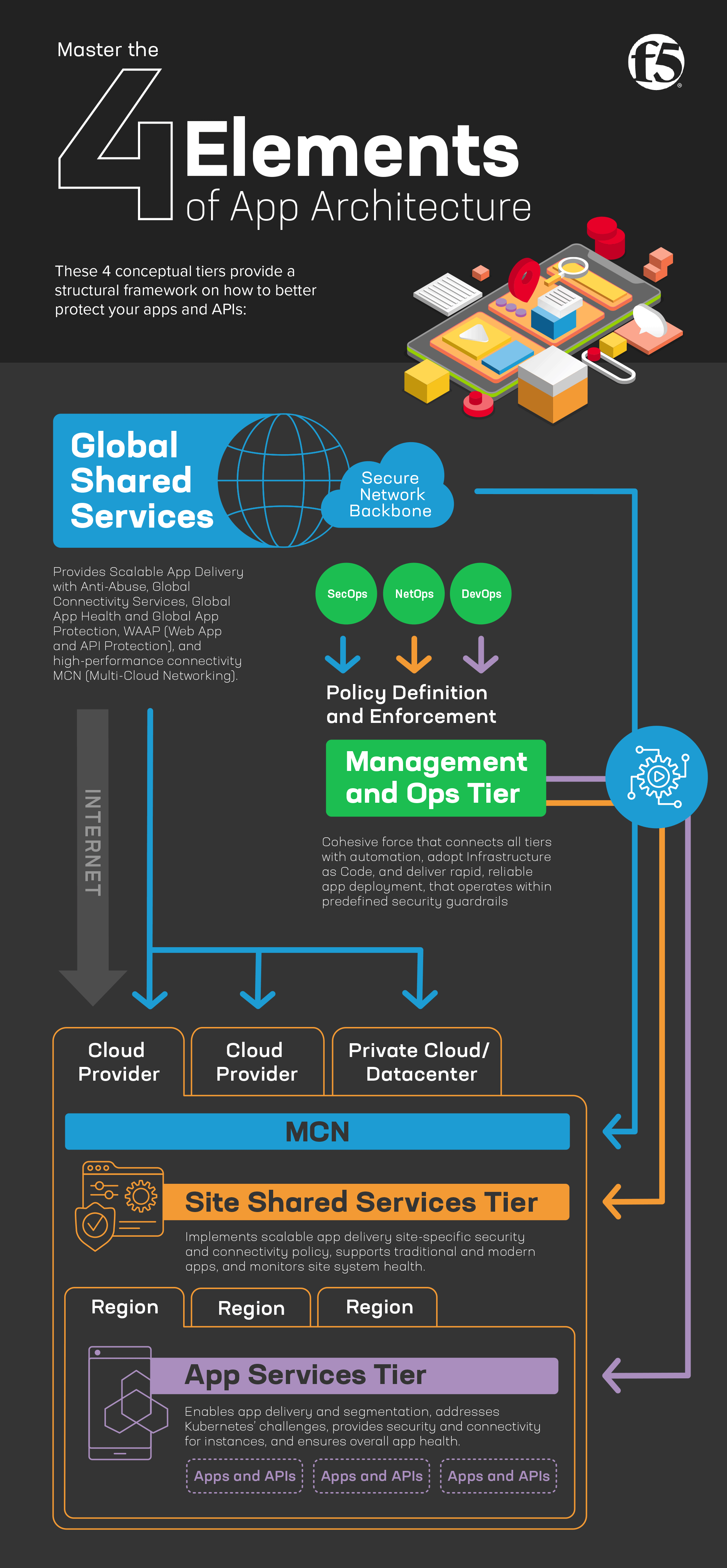 Below are four primary tiers that serve as a foundational structure for app and API security best practices. These tiers are strategic ways to start thinking of how to simplify architectural complexity, and to better consolidate services and be more efficient—or a master of your environment like the Avatar.
