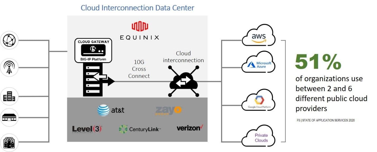 In the role of a cloud gateway, the F5 BIG-IP offers the application services organizations need to provide consistent security/access policies, employ application protections, and provide full visibility into traffic flows and application usage. It can reduce cloud costs by preventing undesirable traffic (bad actors, bots, attacks) from reaching applications hosted in a public cloud provider. It can enhance security by taking advantage of a Equinix SmartKeyTM, a centralized key management solution from to secure traffic, thus eliminating the risky practice of storing encryption keys in a public cloud.