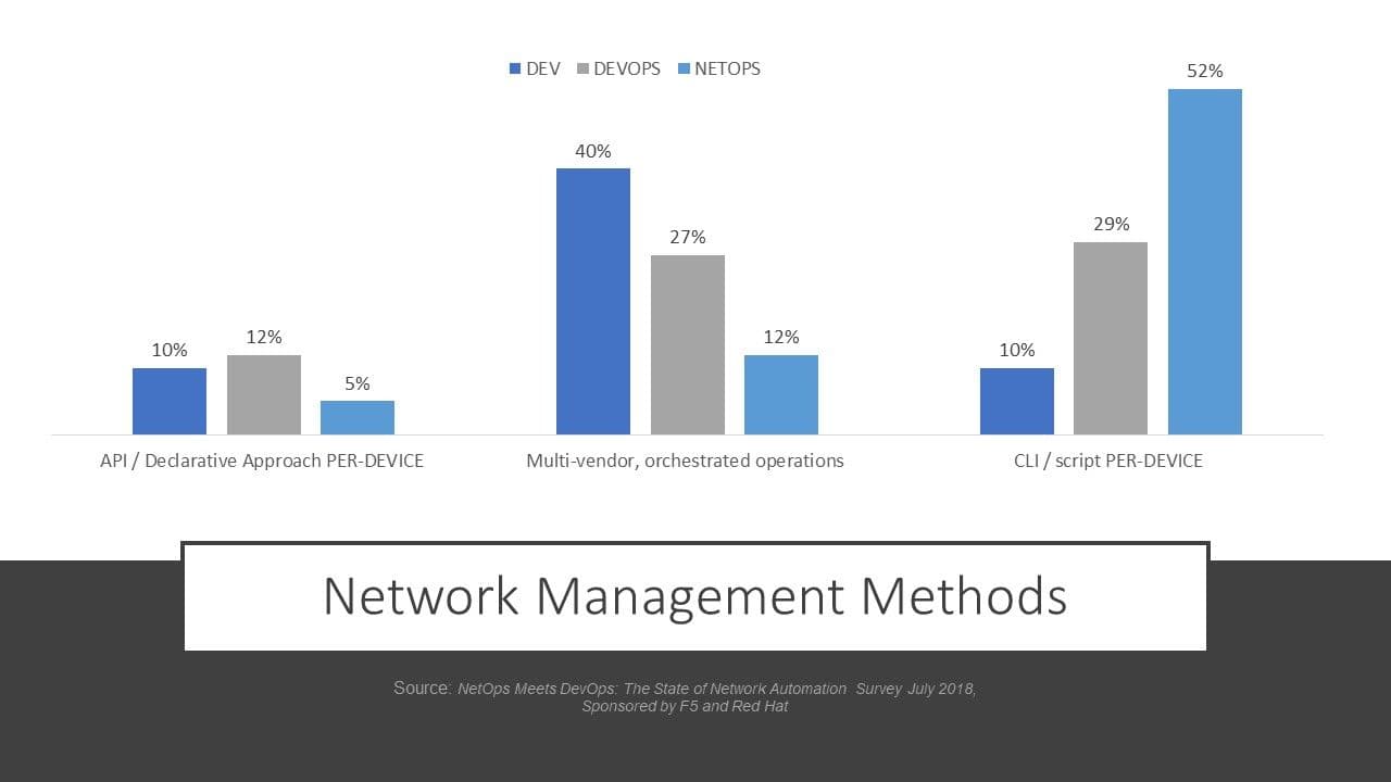 To optimize means finding and eliminating bottlenecks. In the world of IT that’s almost always the hand offs between steps in an operational process. The actual work – the scripts – is the value. The time between those scripts executing is almost always the source of delay and frustration for those waiting on the output. The majority (52%) of NetOps still manage infrastructure in this way.