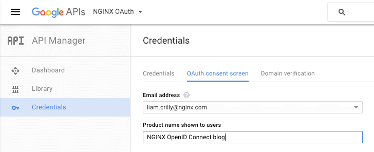 9. On the main Credentials screen, click OAuth consent screen. Provide your email address and a product name (all other fields are optional).