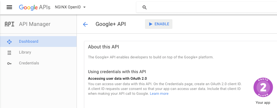 3. Enable the Google+ API for your project. It provides OAuth 2.0 authentication and identity services. (If the API Manager dashboard doesn’t already appear in the main part of the window, click Dashboard in the navigation area on the left of the screen.) The first step in enabling the Google+ API is to click the ENABLE API button.