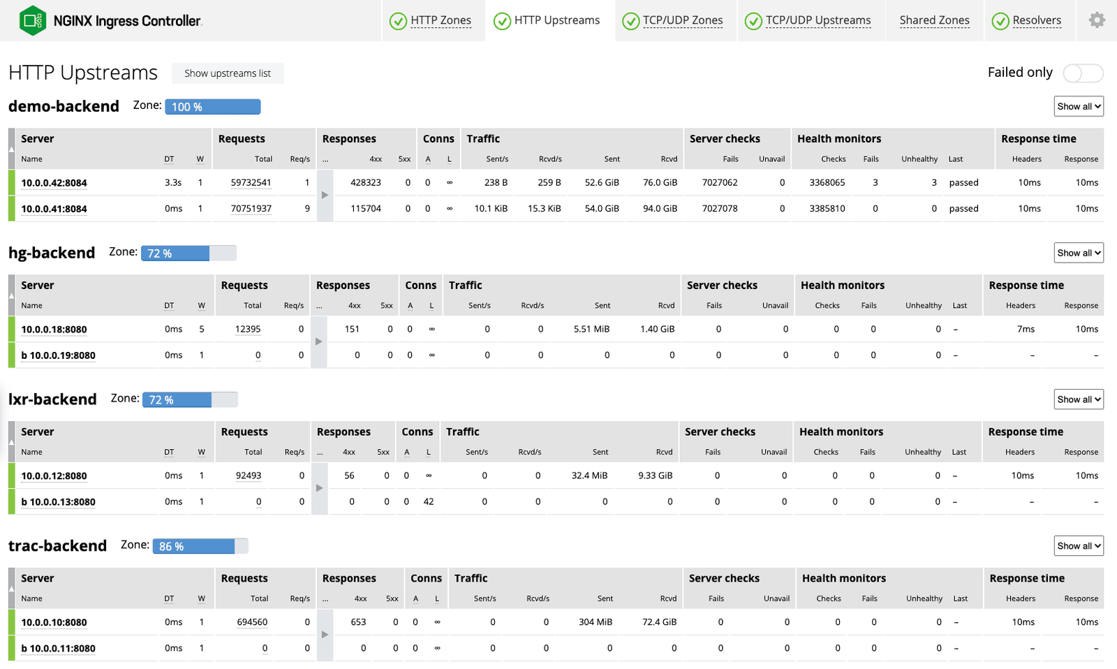 With NGINX Plus, the live activity monitoring dashboard, powered by the NGINX Plus API, displays hundreds of key load and performance metrics. Get fine‑grained detail down to the level of a single pod so you can quickly and easily measure response times to apps and diagnose the source of an issue. Should your Kubernetes environment grow, you automatically get dashboards for each additional NGINX Ingress Controller instance.As an example, two columns on the HTTP Upstreams tab give you an instant read on application and infrastructure status: