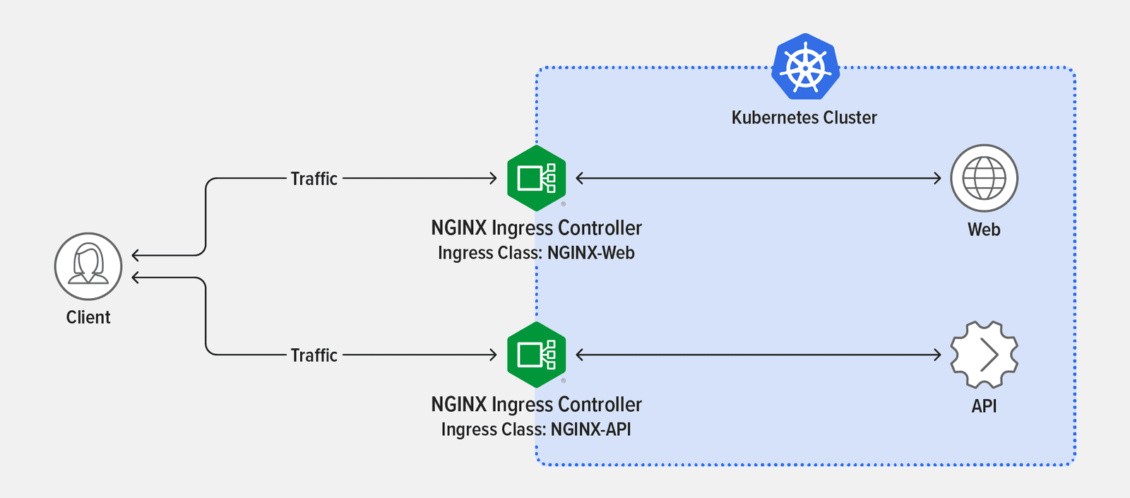 Running a separate NGINX Ingress Controller pod for each of your services prevents your app from being impacted by too many API requests. This isn’t necessarily required for every use case, but in our simulation it’s easy to see the benefits of running multiple NGINX Ingress Controllers.