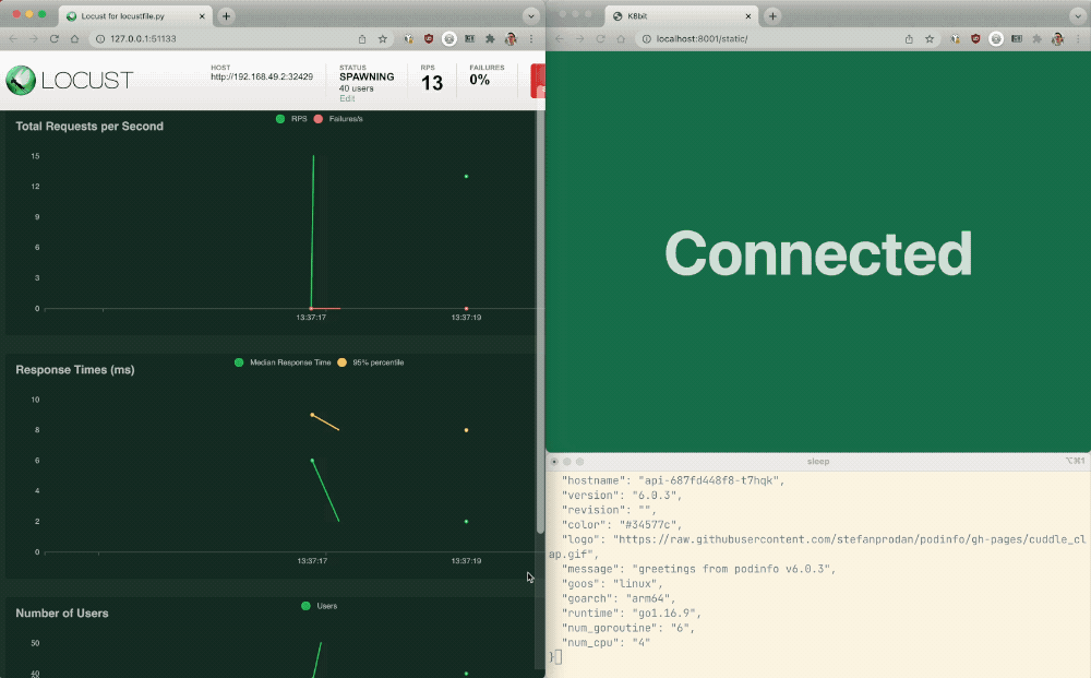 • Failures – Because Podinfo API and Podinfo Frontend share an Ingress controller, the increasing number of API requests soon causes the web app to start returning errors.