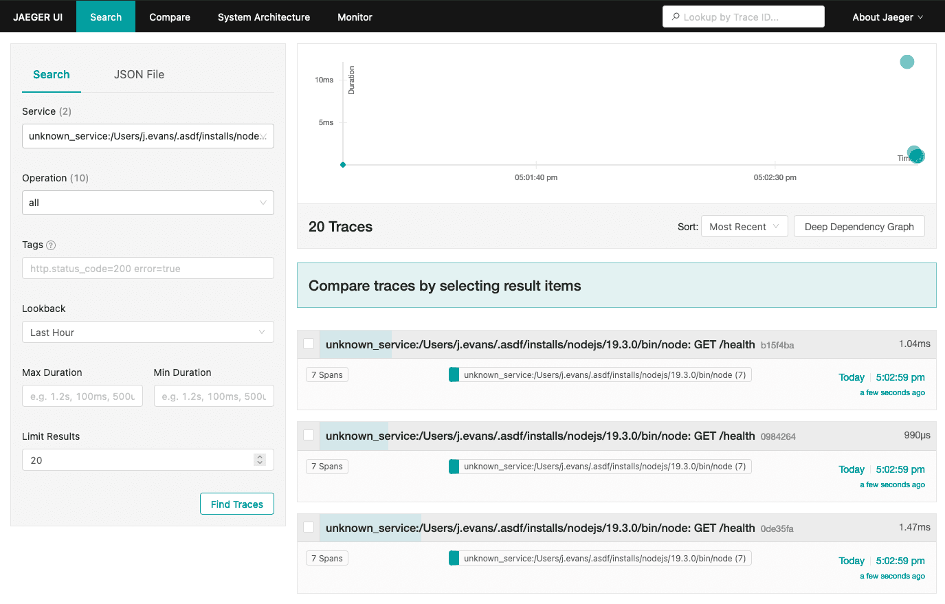 Screenshot of Jaeger GUI showing that the trace no longer includes two spans after you change the instrumentation to filter them out of the trace