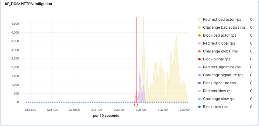 Figure 2 shows NGINX App Protect DoS in the process of detecting anomalous behavior and thwarting a gRPC DoS flood attack using a phased mitigation approach. The red spike indicates the number of HTTP/2 redirections sent to all clients during the global rate‑mitigation phase. The purple graph represents the redirections sent to specific clients when their requests match a signature that models the anomalous behavior. The yellow graph represents the redirections sent to specific detected bad actors identified by IP address and TLS fingerprint.