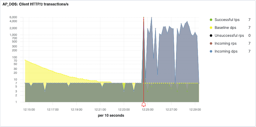 Figure 1 displays a gRPC application experiencing a DoS flood attack. In the context of gRPC, the critical metric is datagrams per second (DPS) which corresponds to the rate of messages per second. In this image, the yellow curve represents the learning process: when the Baseline DPS prediction converges toward the Incoming DPS value (in blue), NGINX App Protect has learned what “normal” traffic for this application looks like. The sharp rise in DPS at 12:25:00 indicates the start of an attack. The red alarm bell indicates the point when NGINX App Protect DoS is confident that there is an attack in progress, and starts the mitigation phases.