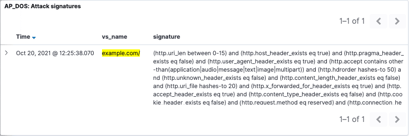 Figure 3 shows a dynamic signature created by NGINX App Protect DoS that is powered by machine learning and profiles the attributes associated with the anomalous behavior from this gRPC flood attack. The signature blocks requests that match it during the initial signature‑mitigation phase.