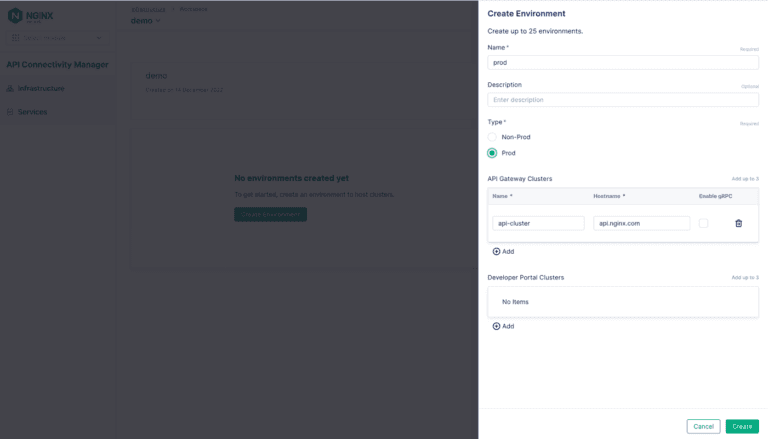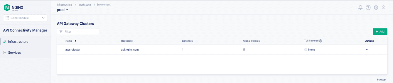 Within an Environment, an API Gateway Cluster is a logical grouping of NGINX Plus instances acting as API gateways. A single Environment can have multiple API Gateway Clusters which share the same hostname (for example, api.nginx.com, as in this tutorial). The NGINX Plus instances in an API Gateway Cluster can be located in more than one type of infrastructure, for example in multiple clouds.
