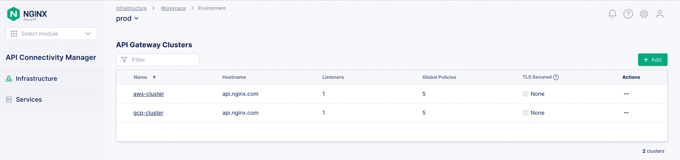 In Deploy NGINX Plus Instances as API Gateways, we deployed two NGINX Plus instances – one in AWS and the other in GCP. The tutorial uses the same instances to illustrate both Environment types (with a single API Gateway Cluster or with multiple API Gateway Clusters); if you want to deploy both Environment types in a single Workspace you would need to create additional NGINX Plus instances for the second Environment.