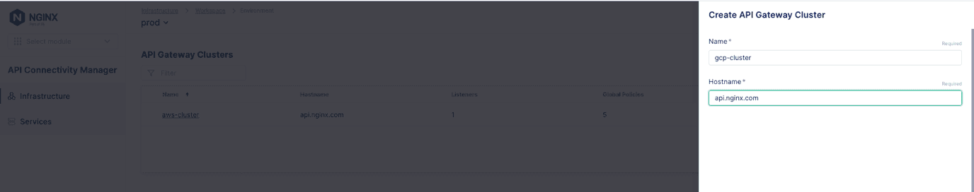 6. On the Create API Gateway Cluster panel, fill in the Name field with the second cluster name (gcp-cluster in Figure 12) and the Hostname field with the same hostname as for the first cluster (api.nginx.com).