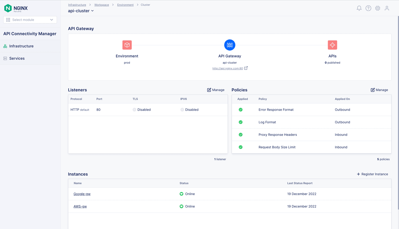 Figure 15: The second of two API Gateway Clusters in an Environment that spans multiple clouds Apply Global Policies Now you can add global policies which apply to all the NGINX Plus instances in an API Gateway Cluster. For example, to secure client access to your APIs you can apply the OpenID Connect Relying Party or TLS Inbound policy. To secure the connection between an API gateway and the backend service which exposes the API, apply the TLS Backend policy. For more information about TLS policies, see the API Connectivity Manager documentation. Conclusion Managing multi‑cloud and hybrid architectures is no easy task. They are complex environments with fast‑changing applications that are often difficult to observe and secure. With the right tools, however, you can avoid vendor lock‑in while retaining the agility and flexibility you need for delivering new capabilities to market faster. As a cloud‑native tool, API Connectivity Manager from NGINX gives you the scalability, visibility, governance, and security you need to manage APIs in multi‑cloud and hybrid environment. Start a 30‑day free trial of NGINX Management Suite, which includes access to API Connectivity Manager, NGINX Plus as an API gateway, and NGINX App Protect to secure your APIs.
