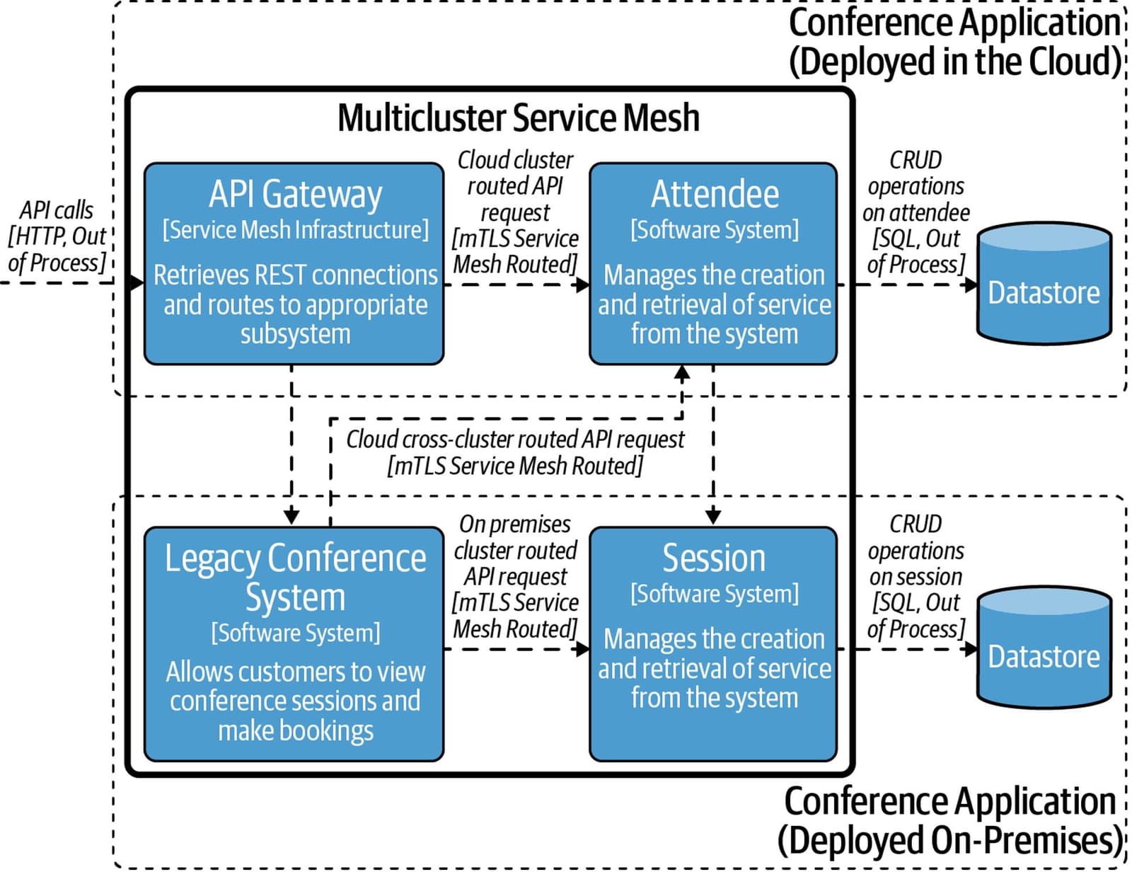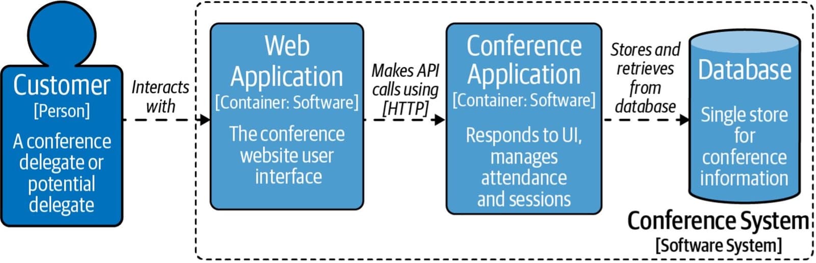 Under the hood, the customer interacts with a web application, which sends API calls to the conference application. The conference application uses SQL to query the backend datastore: