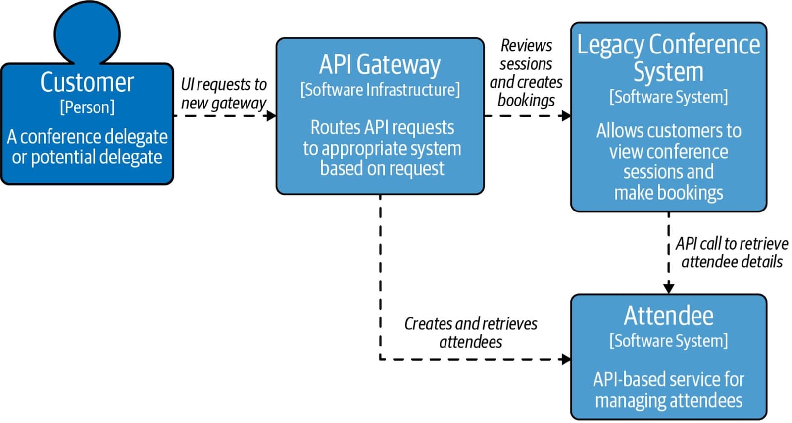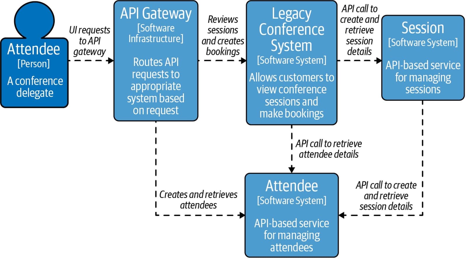 In our hypothetical example, a conference system supports functions such as creation of an Attendee account (create account), review of available sessions (review sessions), and booking attendance (book sessions). The customer interacts with the conference system via a web browser. For example, to book a conference session:
