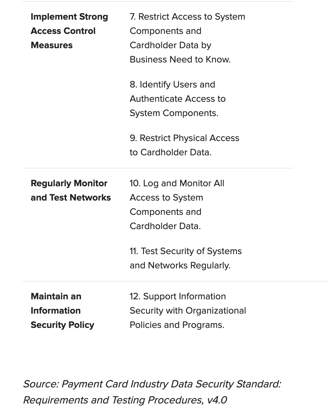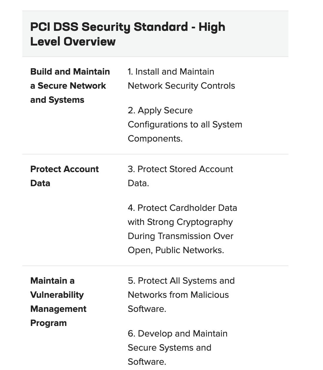 PCI DSS comprises a minimum set of requirements for protecting account data and may be enhanced by additional controls and practices to further mitigate risks. The below table lists the PCI DSS requirements at a high level, F5 qualifies as Level 1 Service Provider and while it does not process, store, or transmit CHD/SAD; it could impact the security of the cardholder data environment (CDE) of our customers.