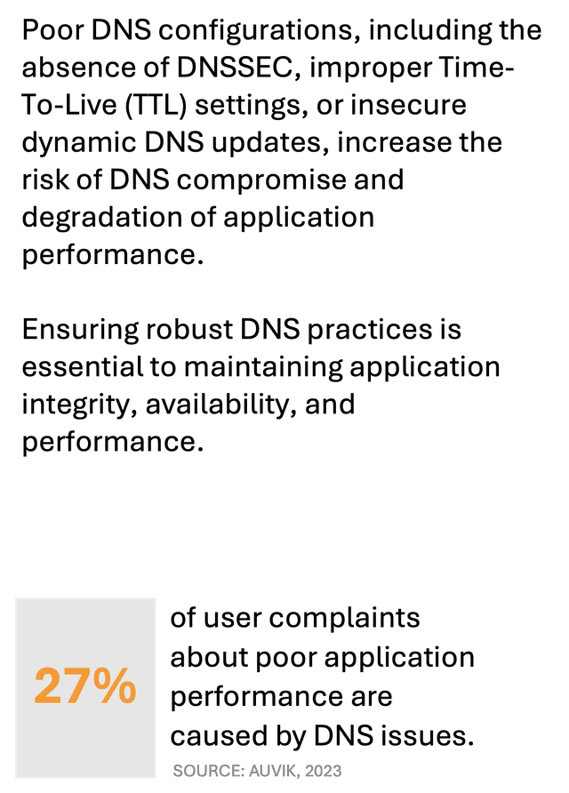 Inadequate DNS security, improper Time-To-Live (TTL) settings, and insecure dynamic DNS updates can create vulnerabilities that affect not only the reliability of applications but also their operational efficiency.