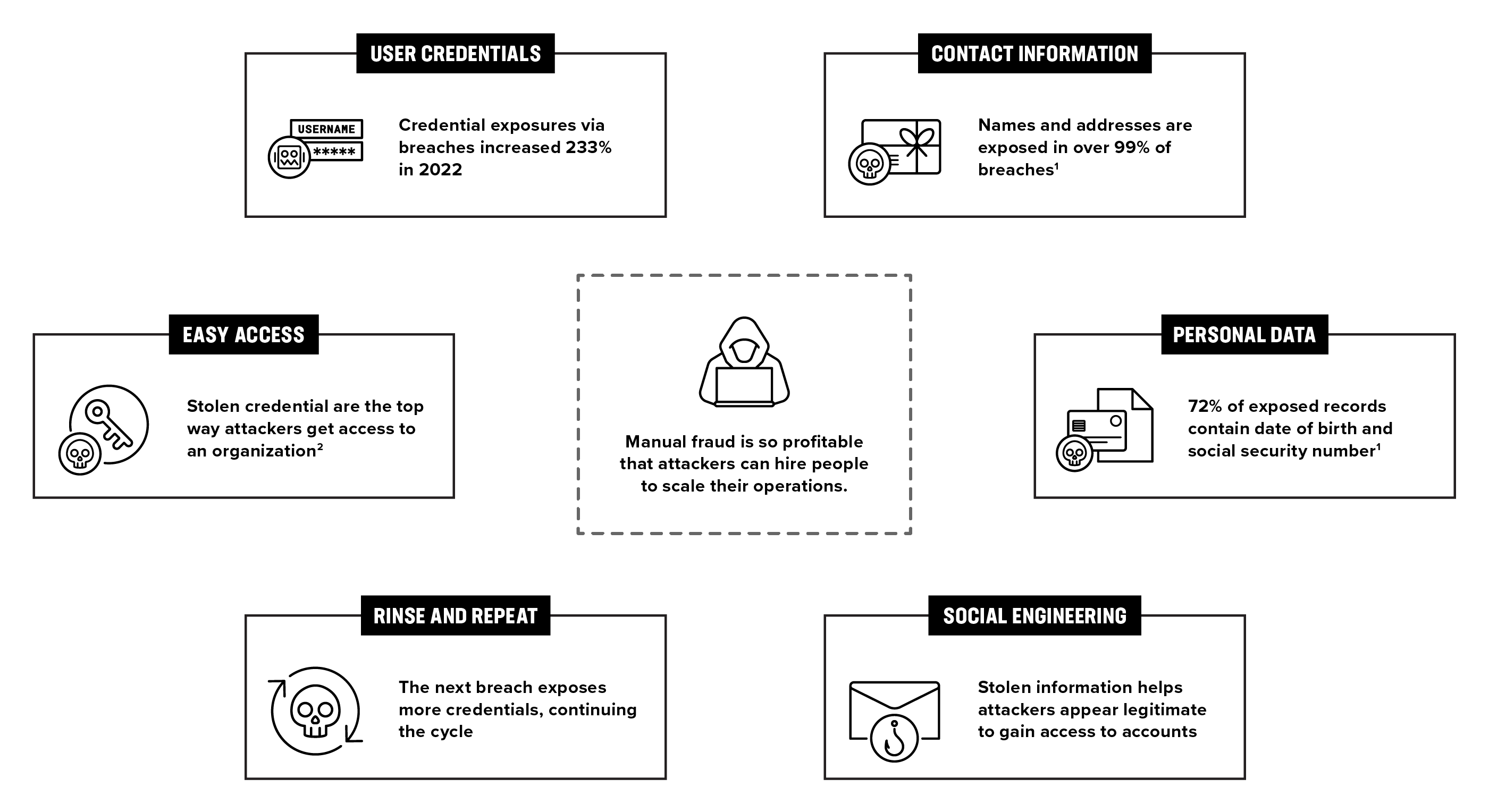 2022년에 보고된 신원 사기의 대부분은 계좌 인수(ATO)로 60%, 신규 계좌 사기로 32%를 차지했습니다( 2022년 신원 도용 자원 센터 신원 동향 보고서 ). 사기꾼은 데이터 침해로 인해 노출된 자격 증명을 사용하여 기존 계정을 인수하는 경우가 많습니다. 도난된 자격 증명은 가장 중요한 액세스 수단이기 때문입니다( Verizon 2023 데이터 침해 조사 보고서 ). 이후의 침해가 증가할수록 자격 증명과 데이터 유출이 더 많아집니다. 사기꾼은 이렇게 빼낸 정보를 모아 함정을 만들고, 사회 공학을 사용하여 계정에 액세스하거나 검증 가능한 데이터로 새로운 계정 사기를 저지릅니다.