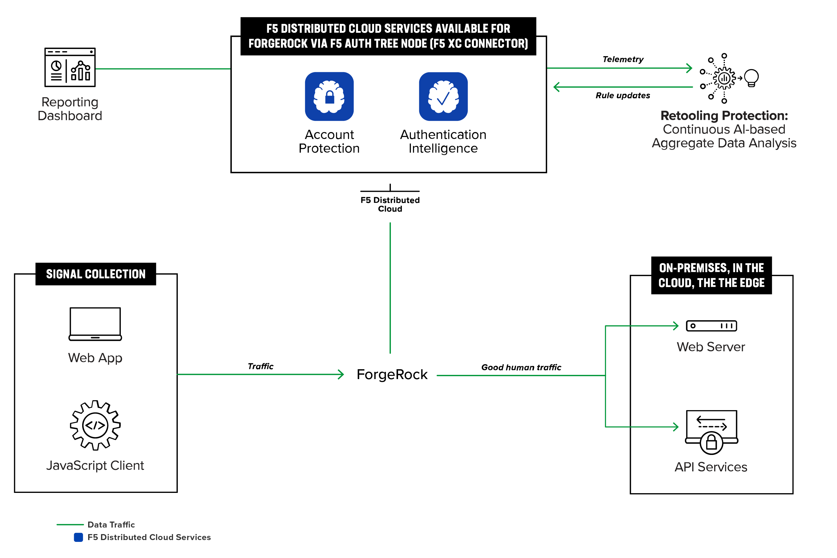 F5 인증 트리 노드 라고도 하는 F5-ForgeRock 커넥터를 사용하면 원활한 환경을 위해 사용자 정의 노드로 인증 트리를 구축할 수 있습니다. 주요 인증 흐름과 통합을 통해, Distributed Cloud Account Protection과 Distributed Cloud Authentication Intelligence는 ForgeRock의 CIAM에서 계정 생성부터 거래까지 사용자 요청을 모니터링합니다. F5는 ForgeRock 트래픽 흐름을 지속적으로 분석하여 악성 행위자로부터 정상적인 인적 트래픽을 구분하므로 사기와 남용을 줄이는 동시에 사업을 성장시키고 우수한 평판을 유지할 수 있습니다.