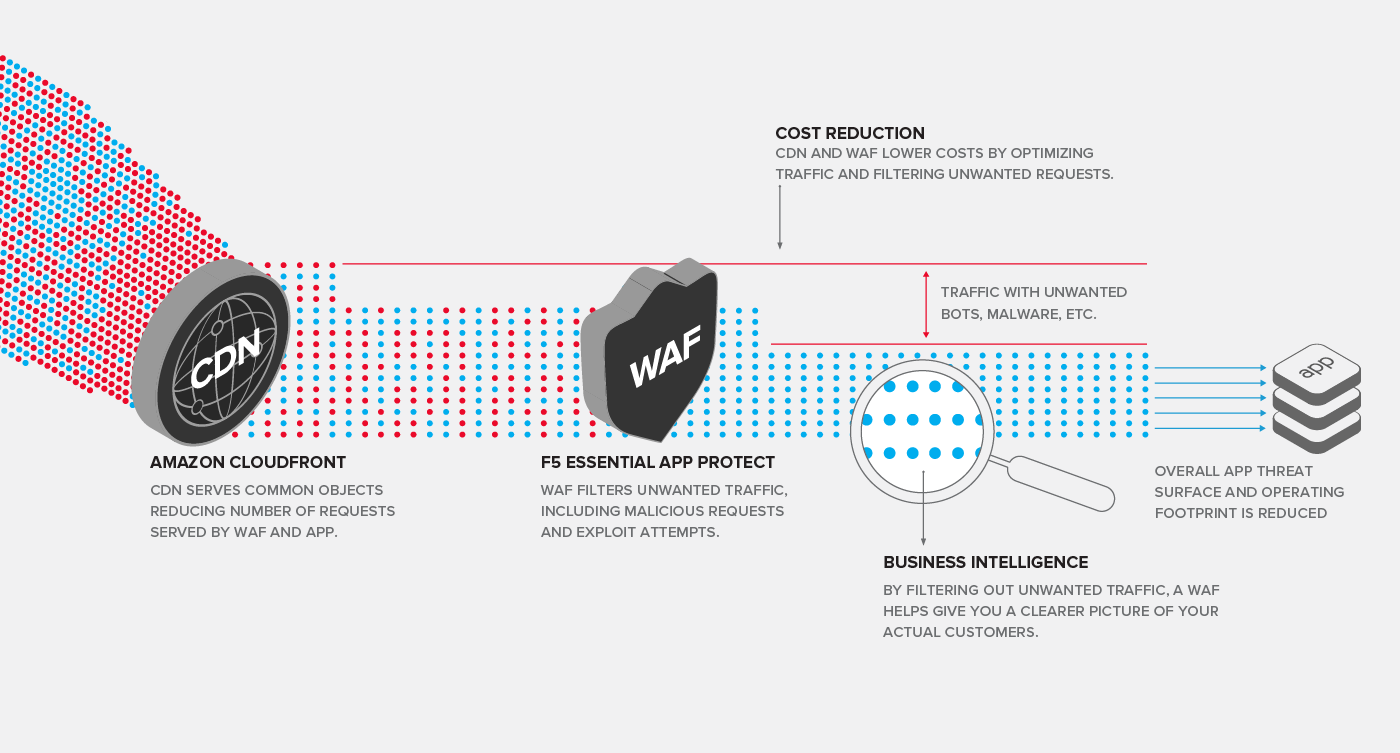 이러한 이유로, 웹 애플리케이션을 보호하기 위한 즉시 사용 가능한 SaaS 보안 솔루션인 F5 Essential App Protect 와 개발자 친화적인 환경에서 낮은 지연 시간과 높은 전송 속도로 전 세계 고객에게 데이터, 비디오, 애플리케이션, API를 안전하게 전송하는 Amazon Web Services(AWS)의 고속 콘텐츠 전송 네트워크(CDN) 서비스인 Amazon CloudFront 의 통합을 발표하게 되어 기쁘게 생각합니다. F5는 AWS의 힘을 활용하여 고객에게 애플리케이션에 대한 캐싱 기능을 제공하여 비용을 절감하고, 보안을 강화하며, 성능을 향상시킵니다. 이 모든 것이 단일 SaaS(Software-as-a-Service) 솔루션에서 제공됩니다. 이는 고객이 애플리케이션에 투자한 것에 대한 장기적 수익률이 높아지고 사용자에게 더 나은 경험을 제공한다는 것을 의미합니다.