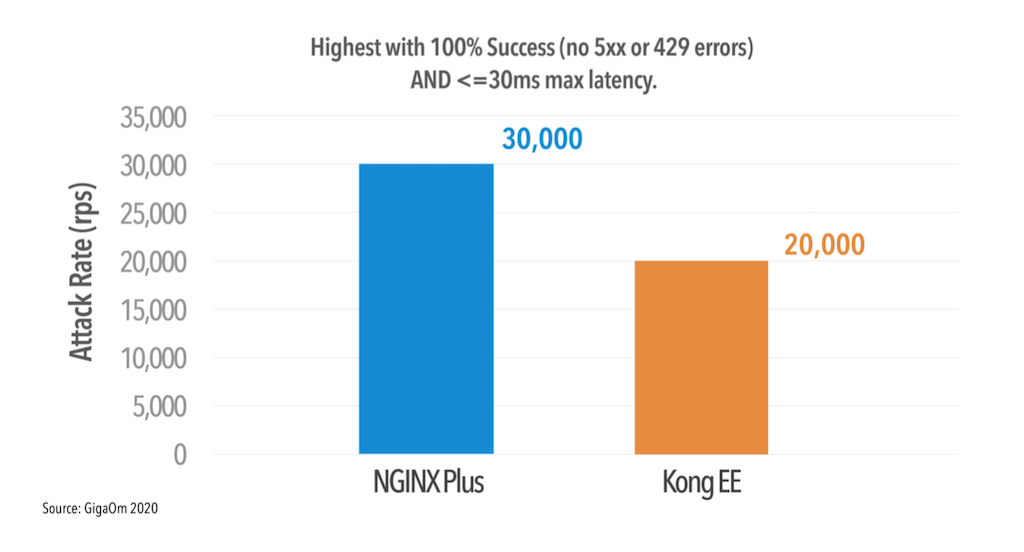 GigaOm은 NGINX Plus(NGINX Controller를 사용하여 배포)와 Kong Node(Kong Enterprise를 사용하여 배포)를 비교하는 두 가지 벤치마크를 수행했습니다. 첫 번째 벤치마크에서는 단일 작업자 노드(NGINX Plus 또는 Kong Node의 인스턴스 하나)가 있었습니다. 두 번째로는 라운드 로빈 모드로 NGINX 오픈 소스로 부하를 분산한 세 개의 워커 노드가 있었습니다. (GigaOm은 NGINX 오픈 소스를 로드 밸런서로 사용해도 NGINX Plus에 이점이 없다고 강조하며, Kong 역시 클러스터링된 Kong 노드 인스턴스에 사용할 로드 밸런서로 NGINX Plus를 권장합니다.)