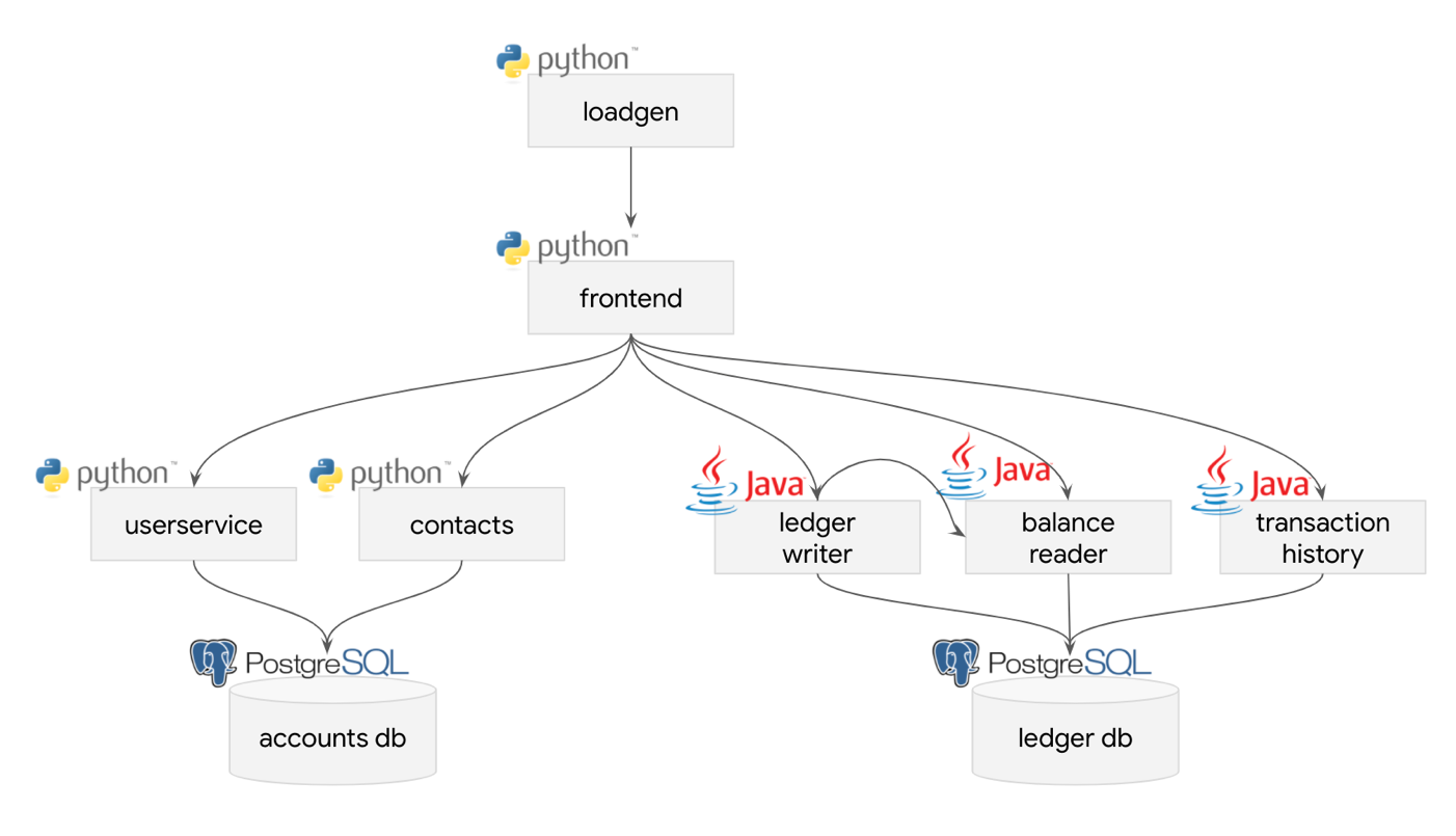관찰 솔루션과 통합할 애플리케이션으로, 우리는 Google의 Bank of Anthos 샘플 앱에서 파생된 Bank of Sirius 를 선택했습니다. 이는 인프라를 코드로 배포할 수 있는 마이크로서비스 아키텍처를 갖춘 웹앱입니다. 이 애플리케이션은 성능과 안정성 측면에서 개선될 수 있는 방법이 많지만, 브라운필드 애플리케이션으로 간주될 만큼 성숙 단계에 접어들었습니다. 따라서 이는 OpenTelemetry를 애플리케이션에 통합하는 방법을 보여주는 좋은 예라고 생각합니다. 이론상 분산 추적은 애플리케이션 아키텍처의 단점에 대한 귀중한 통찰력을 제공하기 때문입니다.