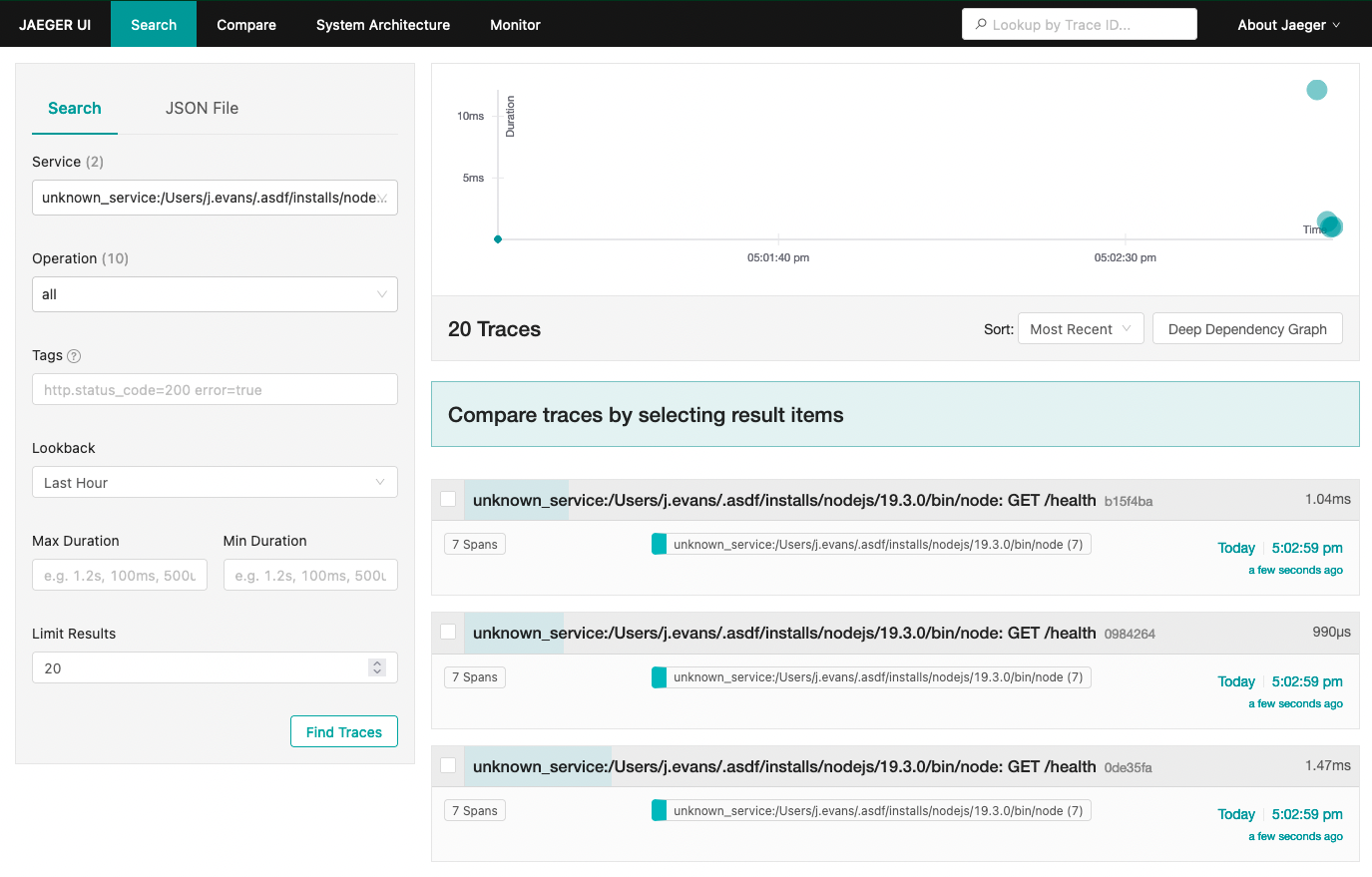 이는 Jaeger UI의 다음 스크린샷에 표시된 스팬 목록에서 파생된 스팬 이름 집합을 정의하며, 이 흐름에 대한 유용한 정보를 제공하지 않기 때문에 추적에서 제외됩니다. 스크린샷에 나열된 다른 스팬도 필요하지 않다고 판단하고 IGNORED_EXPRESS_SPANS 목록에 추가할 수도 있습니다.