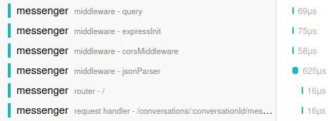 요청 핸들러 및 모든 데이터베이스 작업에 대한 스팬입니다. 일부 미들웨어 span(예: expressInit 및 corsMiddleware )은 관련성이 없는 것으로 보이므로 제거해도 됩니다.다음의 중요 기간이 누락되었습니다.
