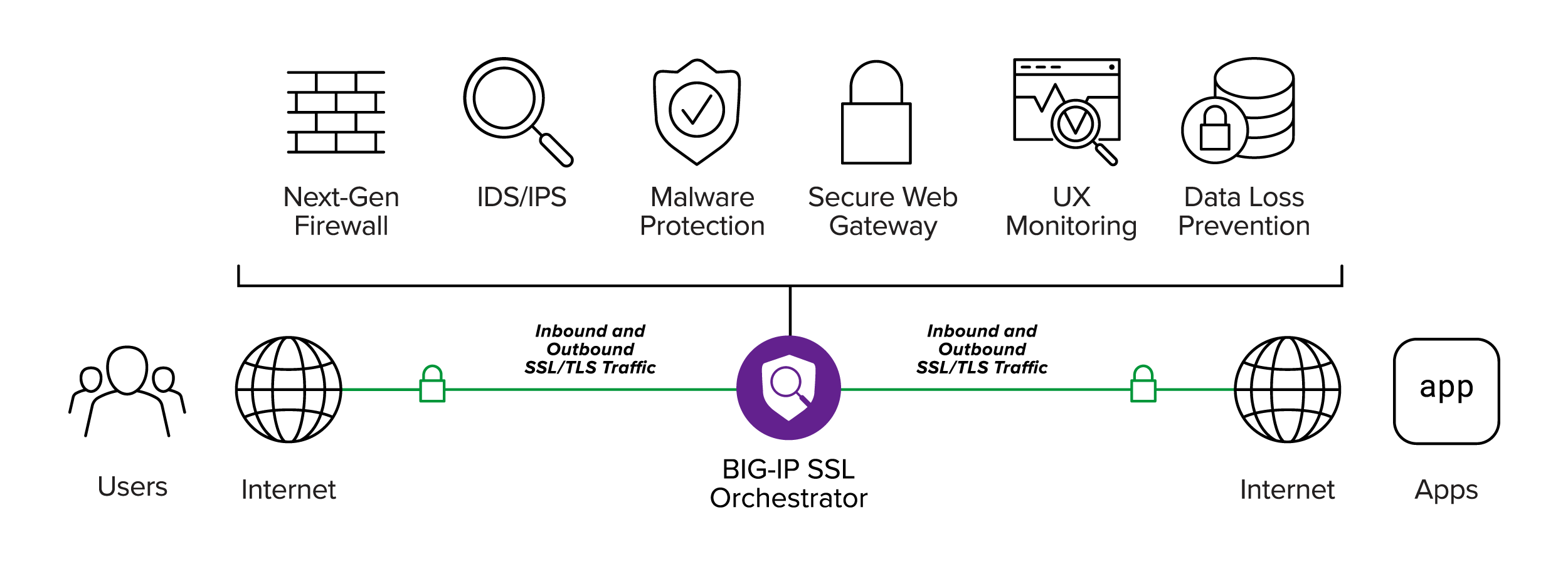 BIG-IP SSL Orchestrator는 암호화된 수신 트래픽을 해독하여 3계층에서 7계층까지의 보호 기능을 제공하므로 보안 스택을 검사하여 위협을 식별하고 다시 암호화할 수 있습니다. BIG-IP SSL Orchestrator를 사용하면 악성 소프트웨어가 외부 사이트에 접속하거나 데이터를 유출하는 것을 방지하기 위해 나가는 트래픽을 쉽게 모니터링할 수 있습니다. 이는 랜섬웨어에서 흔히 볼 수 있는 이중 협박 수법을 막는 데 도움이 됩니다. 즉, 공격자는 초기 몸값을 받지 못하면 훔친 데이터를 훔치고 유출하겠다고 위협합니다. 아웃바운드 트래픽 검사는 이메일 수신자가 링크된 악성 사이트에 연결하지 못하도록 방지하여 가장 흔한 랜섬웨어 벡터 중 하나인 피싱 공격으로부터도 보호합니다.