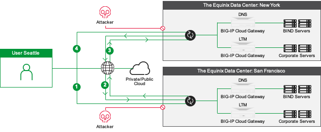 Equinix Fabric을 기반으로 Equinix 플랫폼에 F5 DNS를 적용하면 해당 애플리케이션에 빠르게 액세스할 수 있을 뿐만 아니라 잠재적으로 방해가 되는 공격으로부터도 보호할 수 있습니다. F5 DNS는 통신을 방해하고, 소비자를 잘못된 방향으로 유도하고, 클라우드와 온프레미스에서 호스팅되는 애플리케이션에 대한 액세스를 거부하려는 광범위한 공격을 탐지하고 방지할 수 있습니다. 가용성을 완벽하게 달성하려면 DNS 인프라와 애플리케이션 상태, 정책 기반 확장을 모니터링해야 합니다. F5 DNS는 클라우드 성능, 사용자 위치, 애플리케이션 성능을 포함한 다양한 측정 항목을 기반으로 DNS 및 애플리케이션에 대한 요청을 분산합니다.