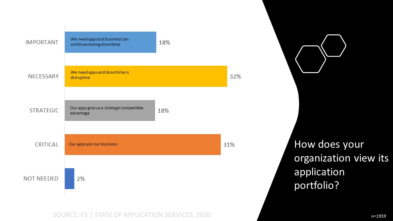 이러한 포트폴리오는 점점 더 중요해지고 있으며, 디지털 혁신 여정에서 앞서 나가는 기업에게는 전략적입니다. 우리는 응답자들에게 그들의 조직이 앱 포트폴리오를 어떻게 생각하는지 물었고, 대부분의 조직이 앱에 의존하고 있으며, 다운타임이 방해가 된다는 사실에 놀라지 않았습니다.