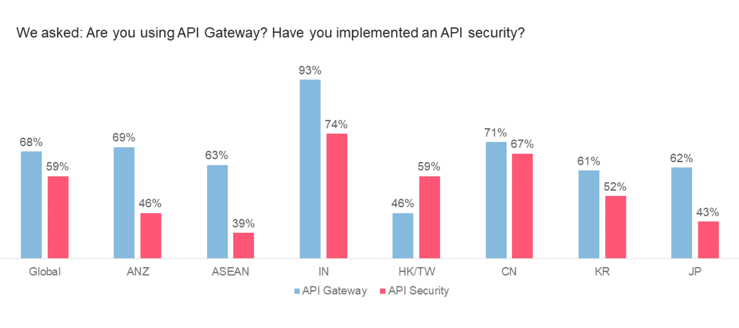 전 세계적으로 그리고 아시아 태평양 국가의 대부분에서 볼 수 있듯이, 기업은 더 나은 API 가시성과 제어를 위해 API 게이트웨이를 구축하는 경향이 있으며, ANZ, 인도, 중국과 같은 지역이 글로벌 평균보다 높은 수준을 보이는 것은 매우 바람직한 일입니다. 나머지 지역은 대체로 세계적 정서와 일치하는 것으로 나타났습니다. 그러나 API 보안을 구축하는 비율 측면에서는 아시아 태평양의 거의 모든 지역에서 API Gateway 구축에 글로벌 평균보다 큰 격차가 있는 것으로 나타났습니다. 결론적으로 이는 아시아 태평양 지역 기업이 잠재적으로 위험에 처해 있음을 시사합니다. 기업은 API 기반 현대화를 추진하여 디지털 생태계를 구축하지만 여전히 API를 보호하는 데는 우선순위를 두지 않습니다. 특히 공개 인터넷에 공개적으로 게시된 Open API에 대해 이야기하는 경우 이 문제는 더욱 심각하고 우려스럽습니다. 유일하게 흥미로운 예외는 HK&TW가 API 보안 우선순위가 더 높은 반면 API Gateway 배포가 매우 낮았다는 것입니다(46% 대비). 59%). 이 지역의 경우, 우리는 높은 수준의 안보 의식을 축하해야 합니다. 그러나 글로벌 평균과 아시아 태평양 지역 대부분이 HK&TW 결과보다 높은 순위를 차지한 만큼, API 게이트웨이 사용을 가속화하면 이로울 것으로 보입니다.