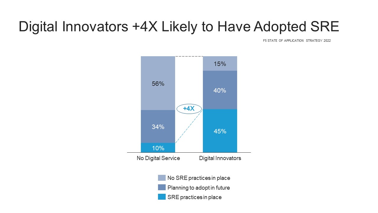 사이트 안정성 엔지니어링(SRE) 방식은 개발 및 운영 전반에 걸쳐 대규모 프로세스를 자동화하여 민첩성, 보안 및 성능에 대한 비즈니스 요구를 충족하는 것을 목표로 합니다. SRE 관행과 디지털 혁신의 중요성을 연결해 보면 디지털 혁신가의 45%가 SRE 관행을 도입한 반면 디지털 서비스가 없는 기업의 경우 불과 10%만이 SRE 관행을 도입한 것으로 나타났습니다. 도입 측면에서 4배의 차이가 있는 것입니다. IDC 에 따르면 올해 6,200억 달러 이상의 지출이 예상됨에 따라, 모든 디지털 혁신 우선순위에서 운영 투자가 두드러진다는 점은 분명합니다.
