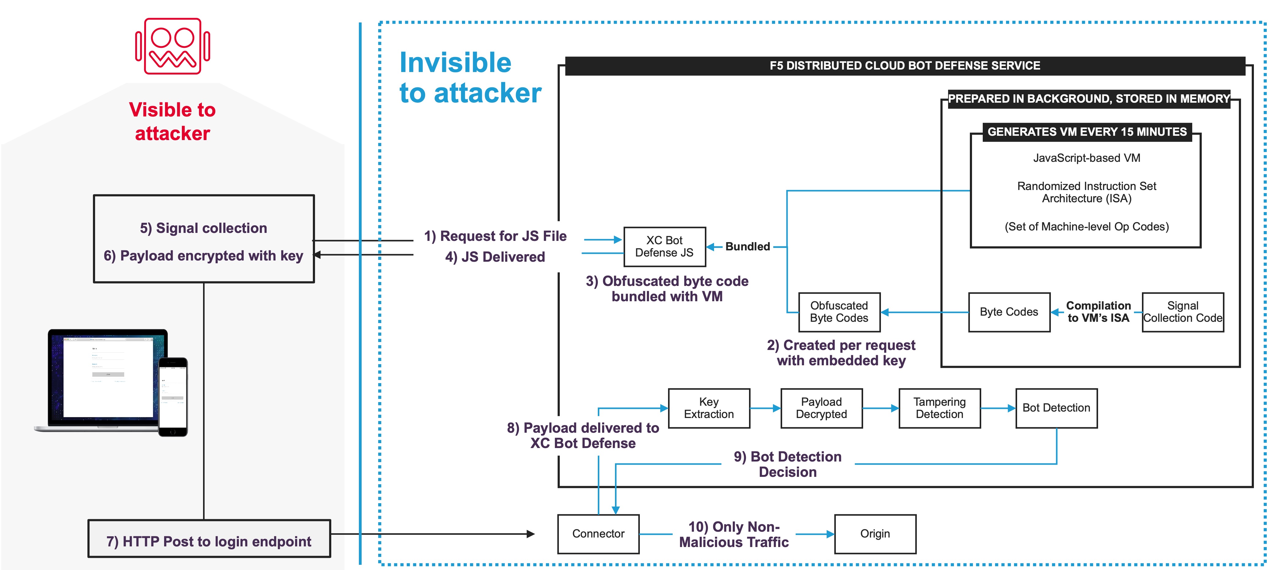 가장 좋은 방어는? 기본적으로 스푸핑이 불가능하고 내구성이 뛰어나며 암호화/난독화된 원격 측정 데이터를 사용하여 다양한 고급 네트워크, 장치, 환경 및 행동 신호를 기반으로 감지합니다. F5의 JavaScript는 맞춤형, 고객별 구현과 머신 수준 명령어 내에서 빈번한 바이트코드 무작위화를 활용하므로 리버스 엔지니어링을 컴퓨팅 측면에서 비현실적으로 만듭니다. 이러한 기술적 이점은 공격자의 조작을 막는 정확한 탐지 및 보안 대책을 제공하는 데 도움이 됩니다.