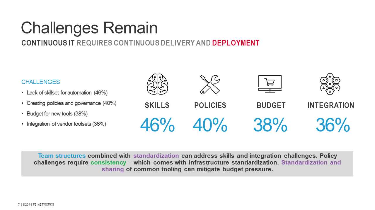 As forças desequilibradas na implantação podem ser encontradas nos desafios citados pela NetOps. Habilidades, políticas, orçamentos e integração são obstáculos significativos para a concretização da implantação contínua. O NetOps sabe criar scripts, não me entenda mal, e eles fazem isso o tempo todo. Mas scripts não são automação e não atendem à necessidade de integração entre potencialmente 14 dispositivos, sistemas e serviços diferentes. A NetOps precisa de ajuda para identificar e colocar em prática as ferramentas e metodologias que não apenas permitem a integração entre esses sistemas distintos, mas também conduzem o processo de implantação de maneira consistente, previsível e repetível.