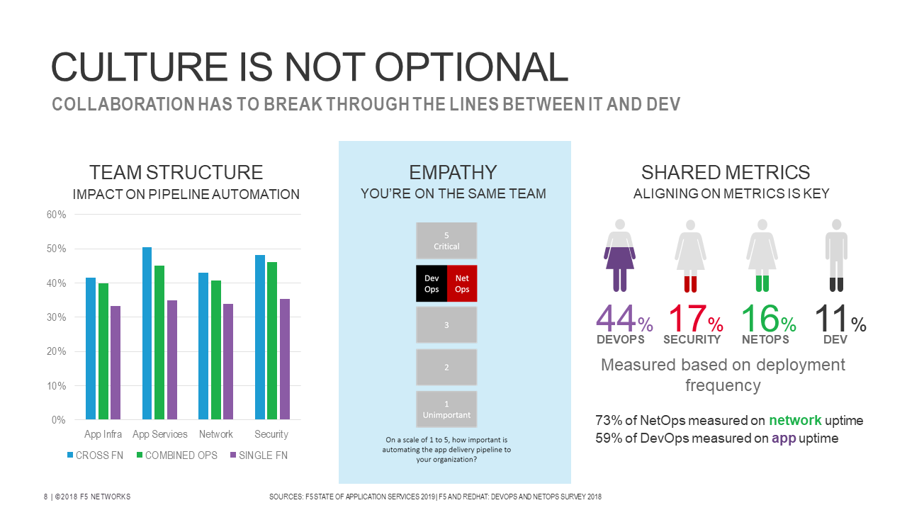 Cultura não é opcional. Tem um impacto muito real nos comportamentos e práticas. A estrutura da equipe por si só muda drasticamente a automação do pipeline, com equipes tradicionais de função única ficando para trás em relação às suas contrapartes contemporâneas orientadas por DevOps. Promova estruturas de equipe mais colaborativas. Na mesma linha, uma equipe colaborativa deve estar alinhada com as principais métricas. Métricas compartilhadas permitem que NetOps e Segurança trabalhem em direção à implantação contínua sem penalidades. Atualmente, quase três quartos do NetOps são medidos com base no TEMPO DE ATIVIDADE DA REDE. A frequência de implantação mal é registrada para eles. Eles vão se concentrar em manter a rede ativa porque é nisso que eles devem se concentrar. Métricas compartilhadas dão à NetOps permissão para se concentrar no que a empresa precisa: implantações mais rápidas e frequentes.