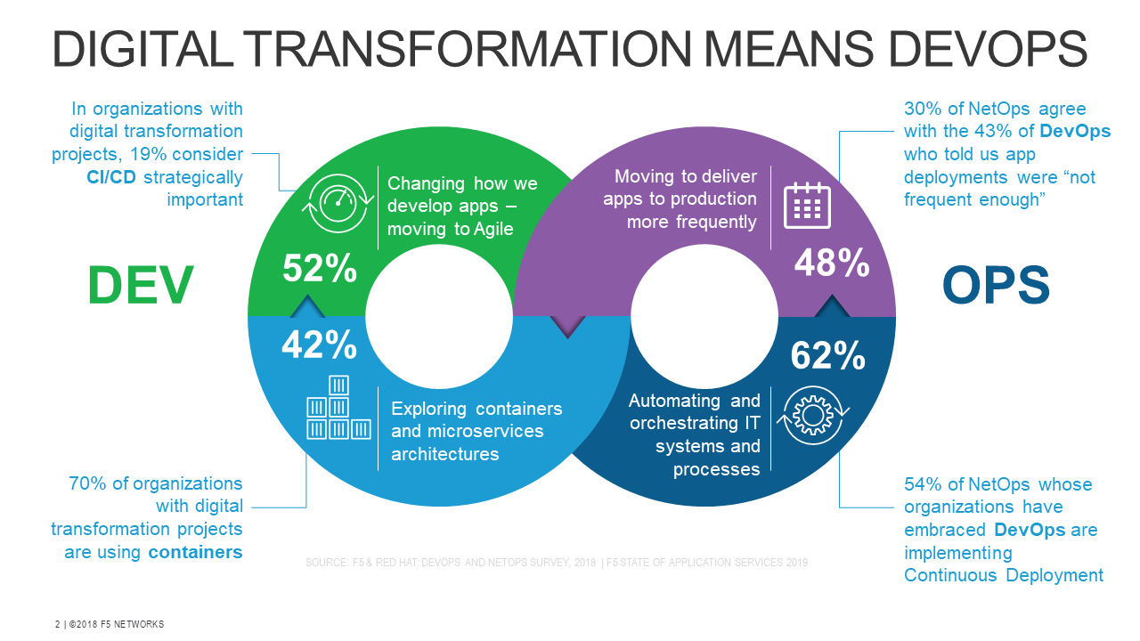 Existe, sem dúvida, uma ligação entre a transformação digital e o DevOps. Por causa do DX, 48% das organizações estão migrando para entregar aplicativos para produção com mais frequência. 62% estão automatizando e orquestrando sistemas e processos de TI. 52% estão mudando a forma como desenvolvem aplicativos (pense no Agile). E 42% estão explorando contêineres e microsserviços. Desde os blocos de construção dos aplicativos até os métodos implementados para colocá-los no mercado, a transformação digital significa que o DevOps tem uma maneira de estender a "entrega contínua" para a "implantação contínua". Lembre-se, "entrega" não significa comercialização, significa produção, onde o processo de implantação entra em ação e coloca o aplicativo em um estado aceitável para consumo.