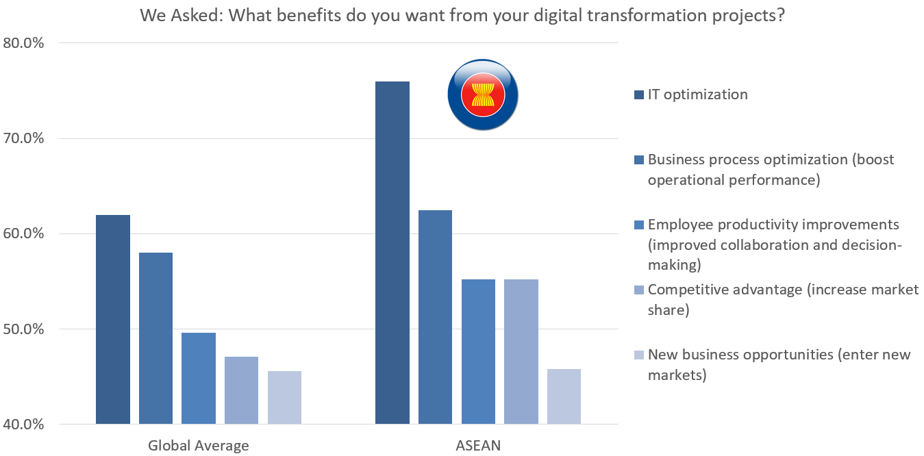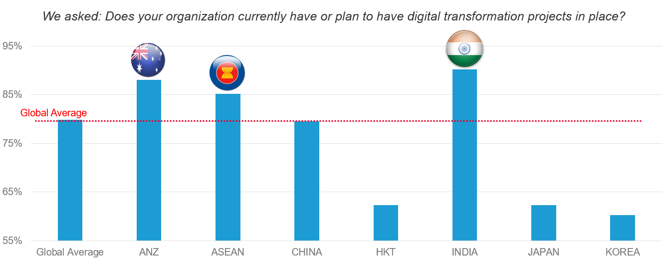 Na Índia, 90% dos entrevistados relataram ter projetos de transformação digital em andamento — a maior porcentagem registrada globalmente. Em seguida vêm Austrália e Nova Zelândia (ANZ), com 88%, e ASEAN, com 85%. No entanto, com a média global em 80%, a Ásia-Pacífico teve uma média menor que a global, de 77%.