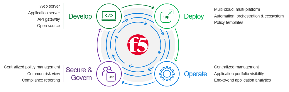 É disso que se trata a proposta de valor da F5, e o princípio subjacente por trás da nossa aquisição da NGINX. Oferecemos soluções para empresas levarem seus aplicativos do código ao cliente , de forma mais rápida, segura e em escala. Chamamos essas soluções de serviços de aplicativos multi-nuvem: ferramentas empacotadas para criadores de aplicativos que facilitam o desenvolvimento, a implantação, as operações, a segurança e a governança em uma arquitetura multi-nuvem.
