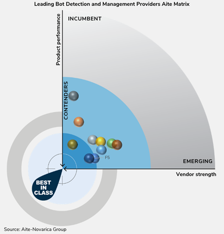 “Os bots se tornaram cada vez mais sofisticados e automatizados, criando uma economia crescente de crimes cibernéticos”, de acordo com o Aite-Novarica Group, uma empresa de consultoria e pesquisa de serviços financeiros. Os criminosos reequipam os bots em minutos para contornar as defesas, utilizam milhões de endereços IP válidos, resolvem CAPTCHAs rapidamente, imitam o comportamento humano e introduzem uma aleatoriedade sutil — tudo isso tornando impraticável que as defesas convencionais mitiguem os bots. As organizações precisam de uma solução especializada em gerenciamento de bots. Matriz Aite do Grupo Aite-Novarica: Os principais provedores de detecção e gerenciamento de bots relatam as principais ofertas de gerenciamento de bots, reconhecendo o F5 Distributed Cloud Bot Defense como a melhor solução da categoria.