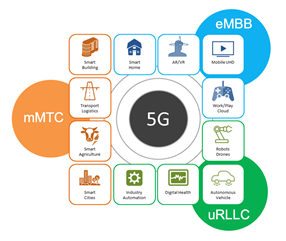Figura 1: Características de uma rede 5G segmentada em 3 principais casos de uso: comunicação massiva do tipo máquina (mMTC), banda larga móvel aprimorada (eMBB) e comunicação ultraconfiável de baixa latência (uRLLC)