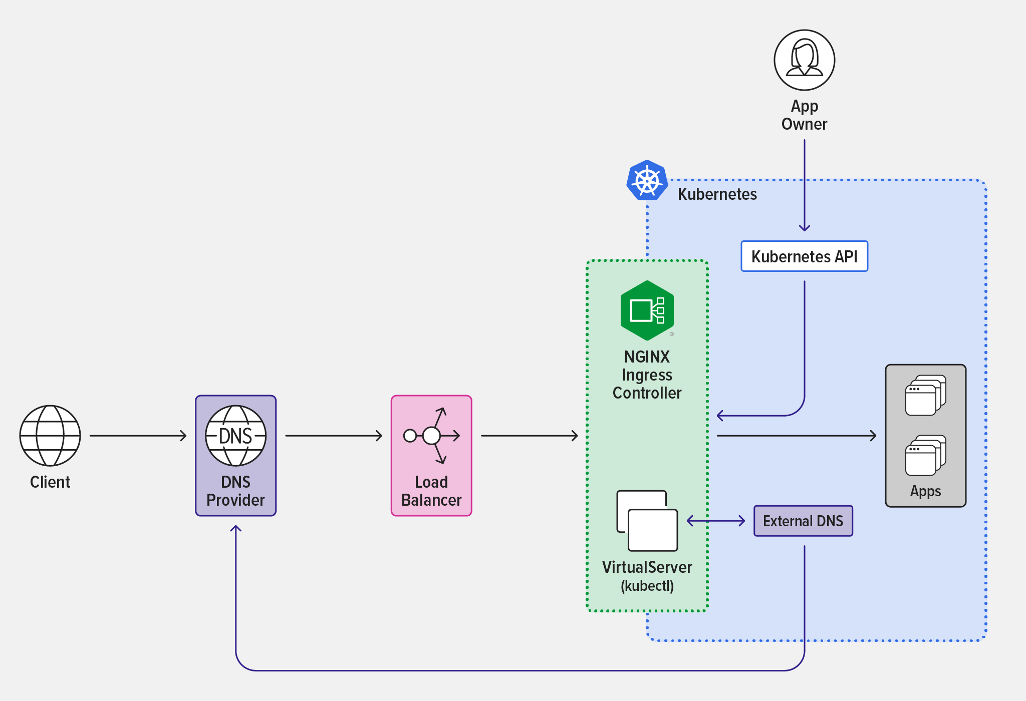 Com uma integração entre o ExternalDNS e o NGINX Ingress Controller , você pode gerenciar registros DNS A de forma que os nomes DNS sejam derivados de nomes de host declarados em um recurso Ingress padrão do Kubernetes ou em um recurso personalizado do NGINX VirtualServer . Desenvolvedores e equipes de DevOps podem aproveitar essa integração em seus pipelines de CI/CD para descobrir aplicativos automaticamente em diferentes clusters, sem envolver a equipe de NetOps (que normalmente é dona do DNS).