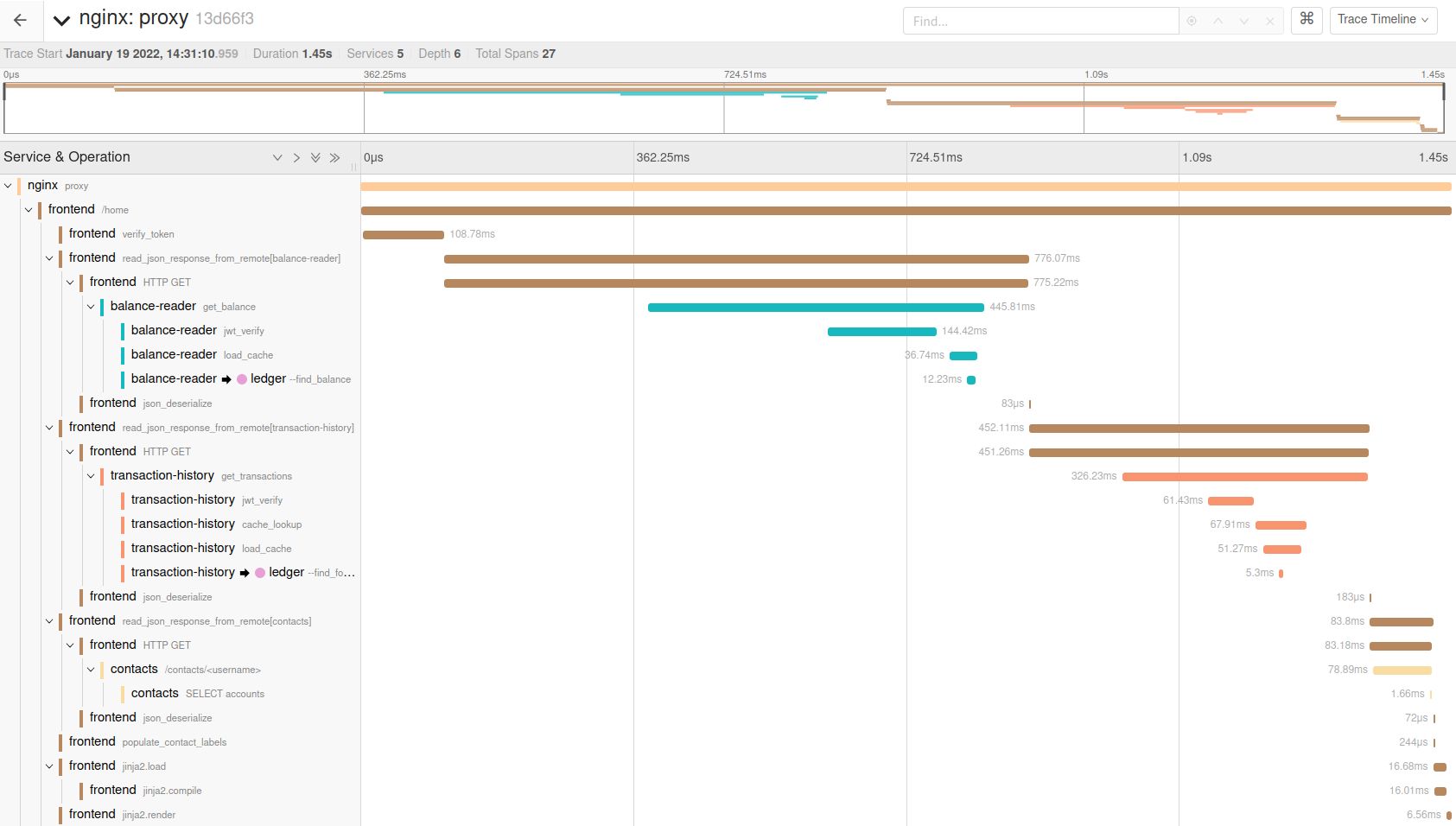 Antes de avançarmos para uma implementação direta do rastreamento no código, primeiro conectamos o OpenTelemetry Collector para enviar todos os dados de rastreamento para uma instância Jaeger em execução local, onde poderíamos ver a saída mais facilmente. Isso foi muito útil, pois pudemos brincar com a apresentação visual dos dados de rastreamento enquanto descobríamos como integrar totalmente o OpenTelemetry. Por exemplo, se descobrirmos que uma biblioteca de cliente HTTP não incluiu dados de rastreamento ao fazer chamadas para um serviço dependente, colocamos o problema em nossa lista de correções imediatamente. Jaeger apresenta uma bela visão de todos os diferentes intervalos dentro de um único traço:
