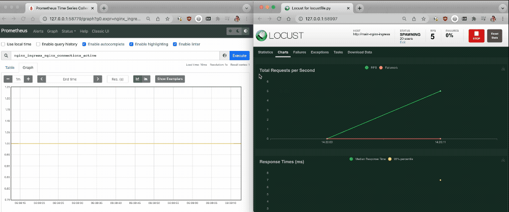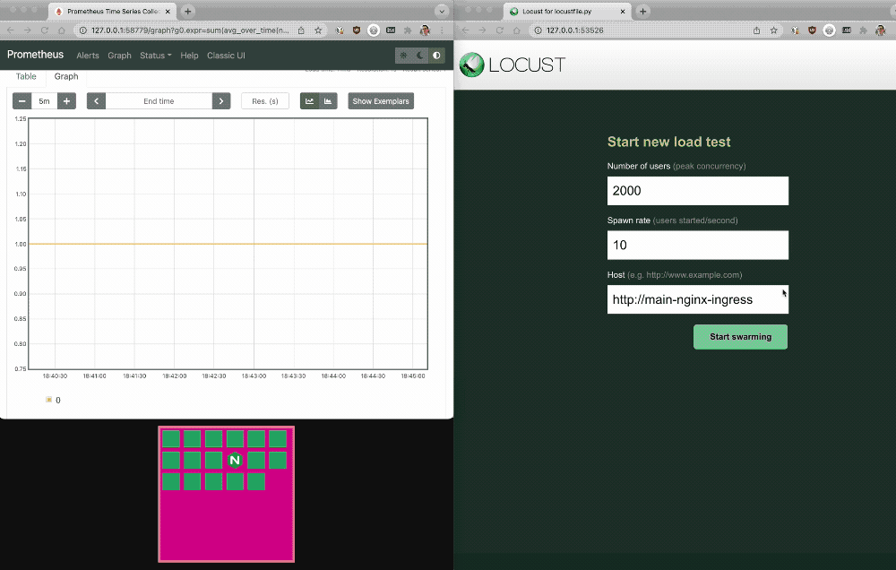 Retorne aos painéis do Prometheus e do Locust. A caixa rosa abaixo do gráfico do Prometheus representa o número de pods do NGINX Ingress Controller aumentando e diminuindo.