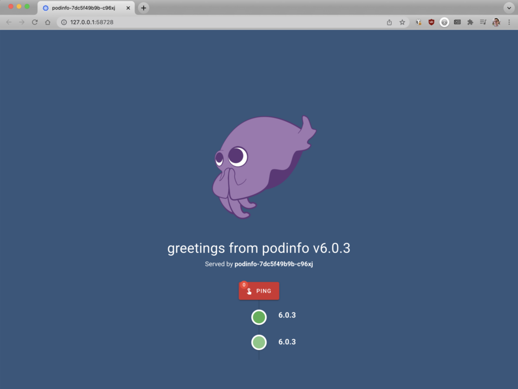 Podinfo é um “aplicativo web feito com Go que demonstra as melhores práticas de execução de microsserviços no Kubernetes”. Estamos usando-o como um aplicativo de exemplo devido ao seu tamanho reduzido.